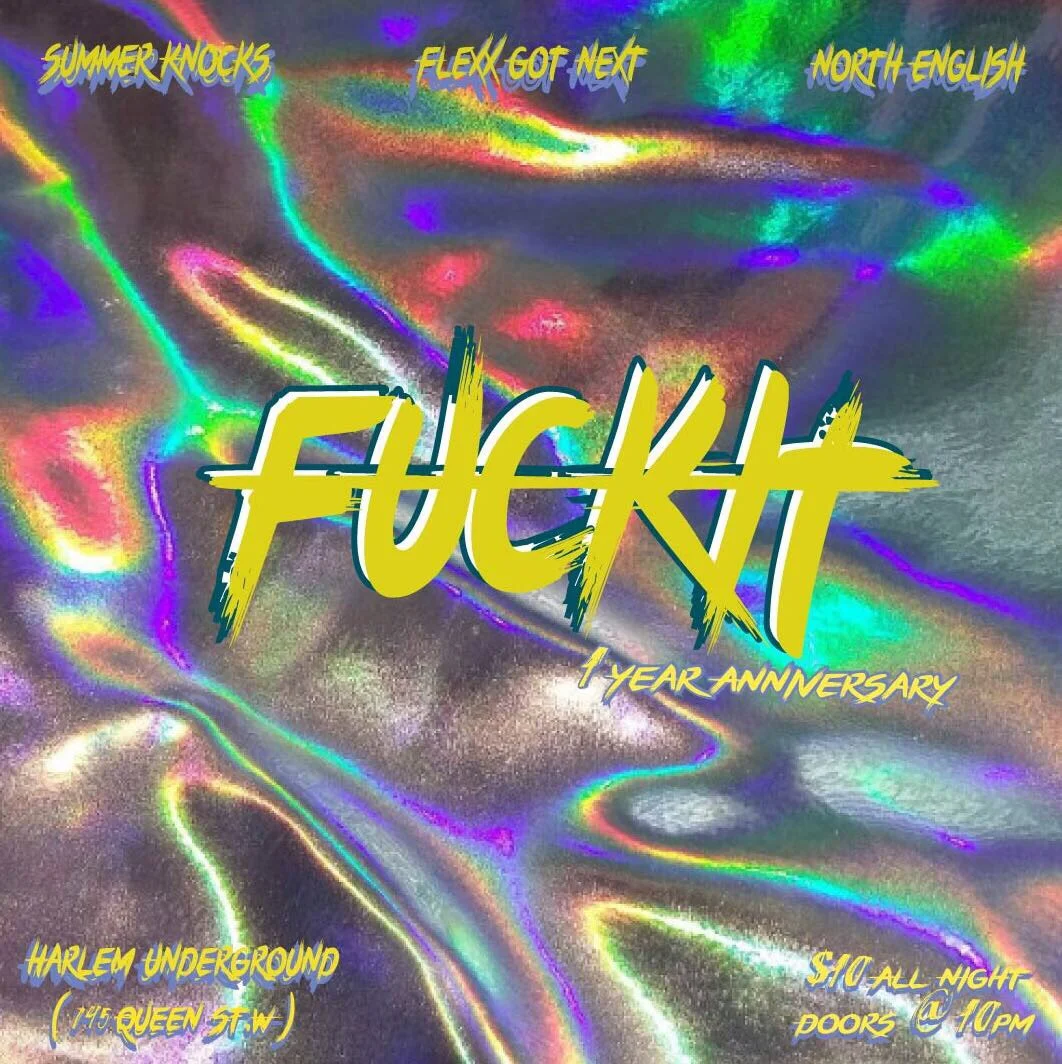 FUCK IT - 1 Year Anniversary Monday, May 1, 2017 10:00 p.m. Tuesday, May 2, 2017 2:00 a.m. Harlem Underground 745 Queen Street West Toronto, Ontario Canada (map) Google Calendar ICS