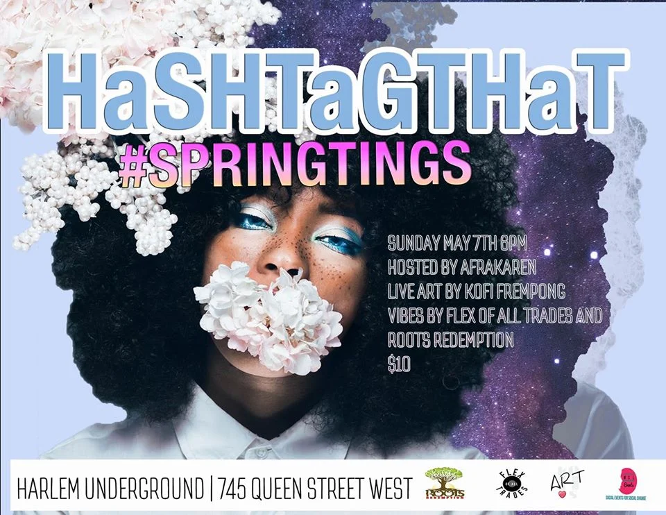 Back to All Events HaSHTaGTHaT #Springtings Sunday, May 7, 2017 8:00 p.m. Monday, May 8, 2017 1:00 a.m. Harlem Underground 745 Queen Street West Toronto, ON, M6J 1G1 Canada (map) Google Calendar ICS